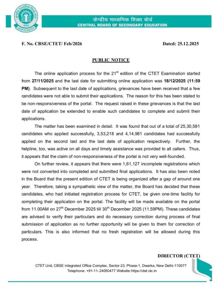 CTET-2026 | Form Completion Date Extended